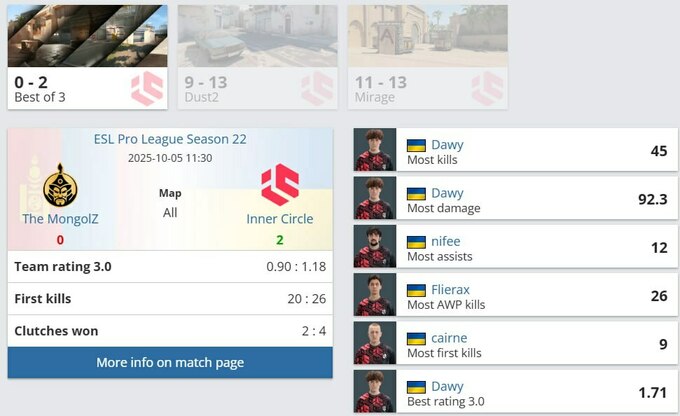 Українська команда Inner Circle продовжує свою вражаючу серію на ESL Pro League, обігравши The MongolZ з рахунком 2:0 – 13:9 на Dust2 та 13:11 на Mirage. Ця поразка поставила монгольську команду на межу вильоту з турніру.