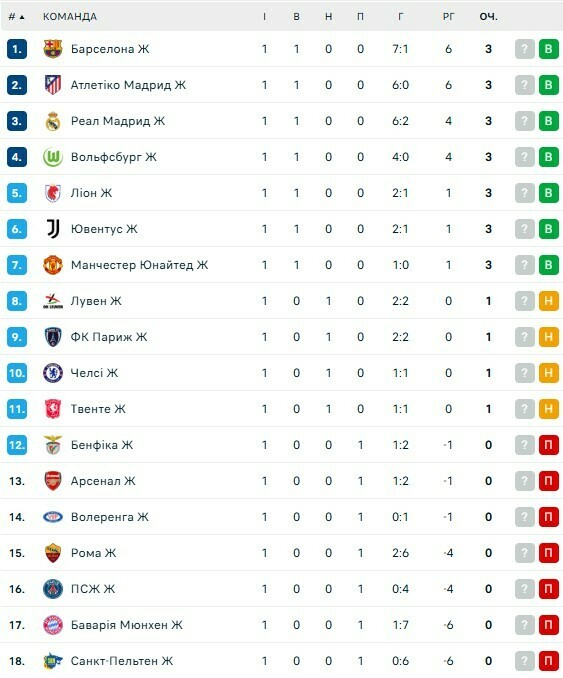 За підсумками першого туру 7 команд лідирують із 3 очками: Барселона, Атлетіко, Реал, Вольфсбург, Ліон, Ювентус, МЮ.
