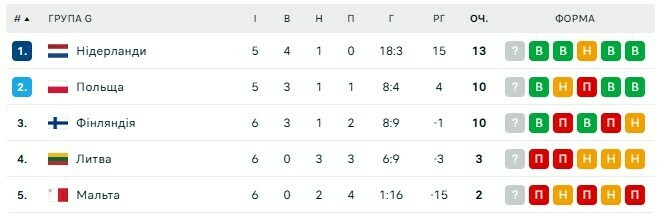 Становище у групі G: Нідерланди (13 очок), Польща, Фінляндія (по 10), Литва (3), Мальта (2).