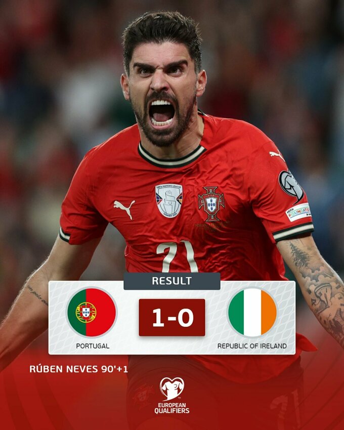 Кріштіану Роналду не забив пенальті, але Португалія вирвала перемогу в Ірландії (1:0) із голом Рубена Невеша на 90+1 хвилині.