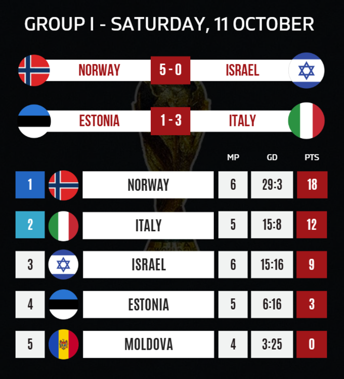 Хет-трик оформив Ерлінг Холанд у матчі Норвегії проти Ізраїлю (5:0), що зміцнило лідерство його збірної.
