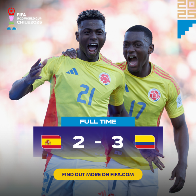Збірна Колумбії U-20 пробилася до півфіналу чемпіонату світу U-20, здолавши Іспанію у видовищному поєдинку з п’ятьма голами (3:2).