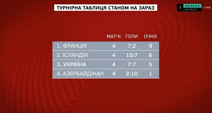 Турнірне становище в групі D в режимі Live: Франція (9), Ісландія (6), Україна (5), Азербайджан (2).