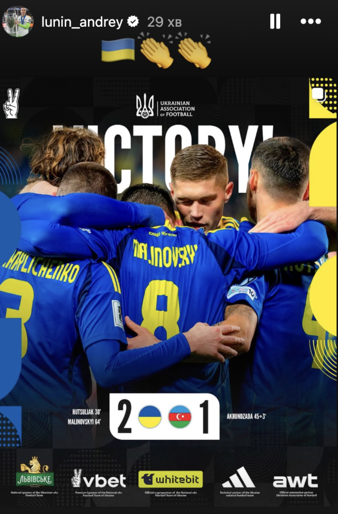 ФОТО. Лунін без слів відреагував на перемогу України проти Азербайджану