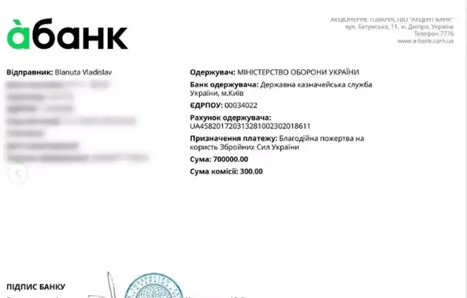 Футболіст «Динамо» Владіслав Бленуце підтвердив, що задонатив на Збройні сили України свою зарплату, показавши чек на суму в 700 тисяч гривень.