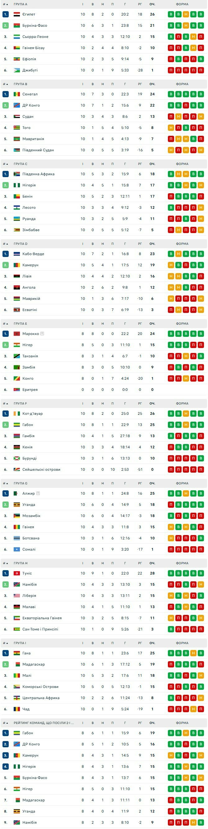 Ще 4 команди (найкращі у рейтингу других місць) зіграють у плей-офф: Габон, ДР Конго, Камерун, Нігерія.
