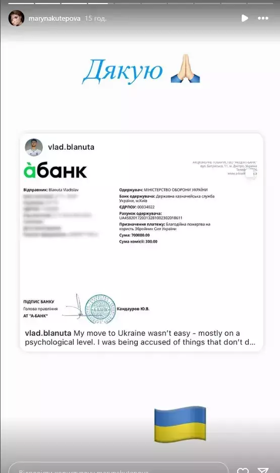 «Дякую 🇺🇦», – написана Марина Кутепова в Інстаграмі.