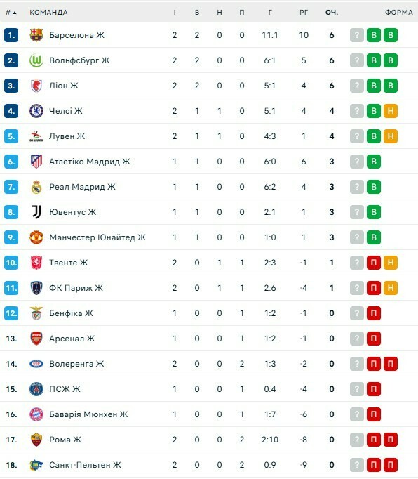У турнірній таблиці лідирують: Барселона, Вольфсбург, Ліон (по 6 очок).