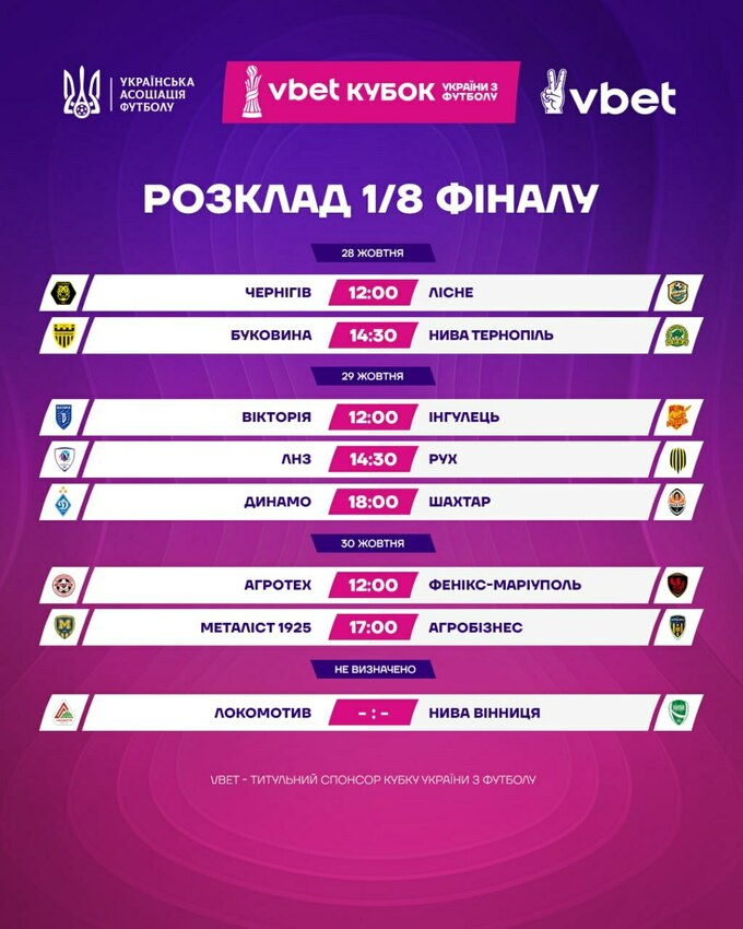 УАФ затвердила дати проведення та час початку матчів 1/8 фіналу Кубка України.
