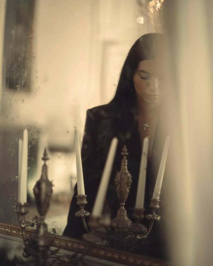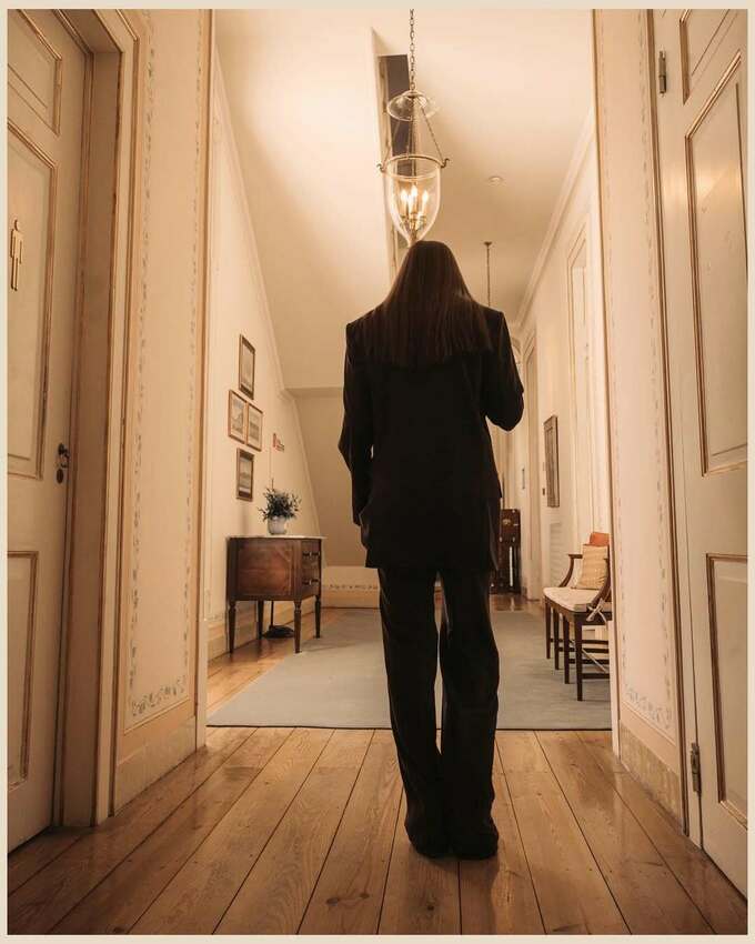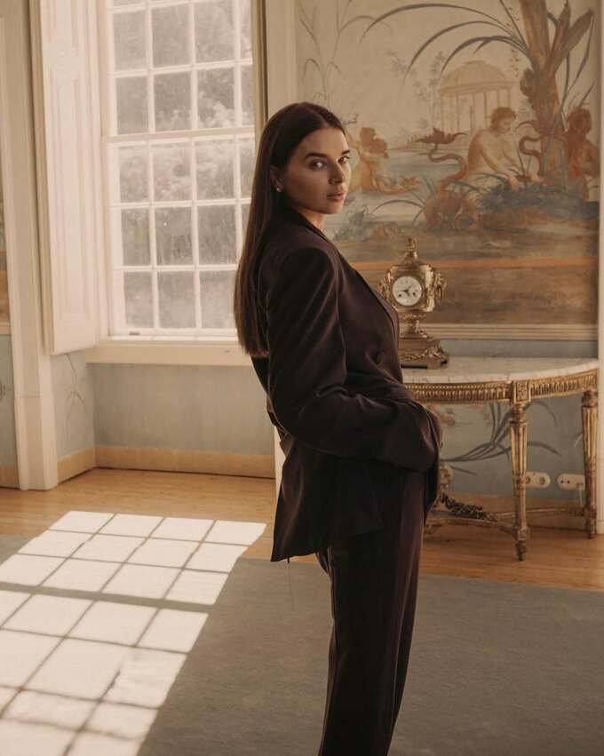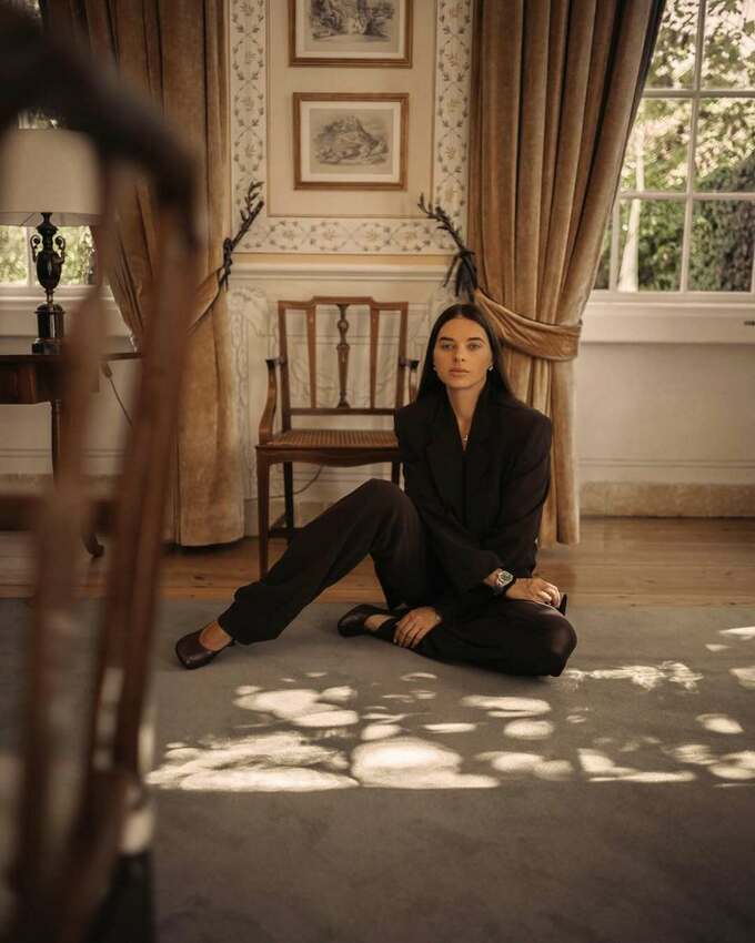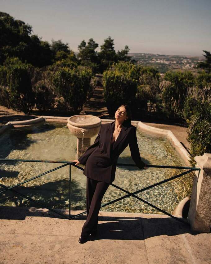 На фотографіях Катерина позує в елегантному чорному костюмі – стримано, стильно й із сильною енергетикою. Локації зйомки – старовинний інтер’єр і мальовничий сад – створюють атмосферу вишуканості та гармонії.