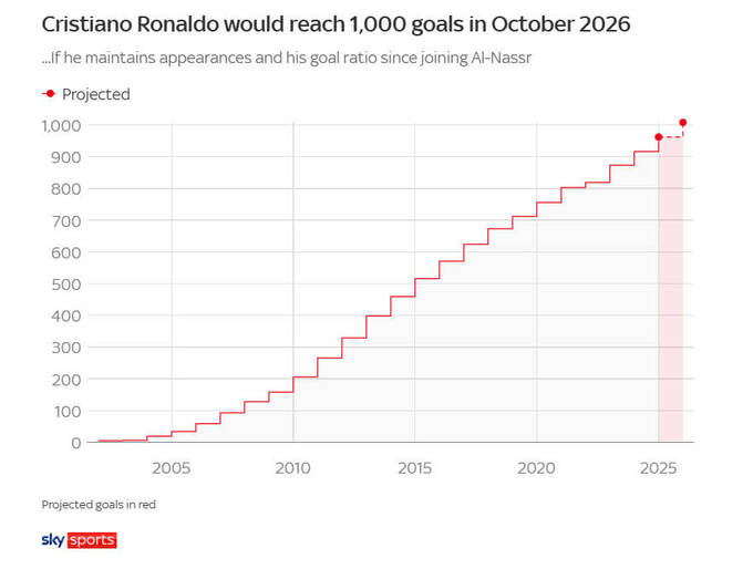 Згідно з графіком і аналізом Sky Sports, враховуючи, що Португалія готується до участі в чемпіонаті світу в 2026 році, а контракт 40-річного Роналду з «Аль-Насром» закінчується через два роки, 1000-й гол португальця припаде на жовтень 2026 року.
