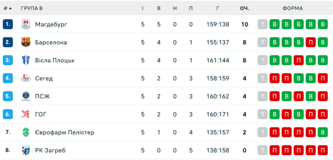 У групі В Магдебург виграв п'ятий матч. Команда на виїзді з рахунком 34:30 здолала угорський Сегед.