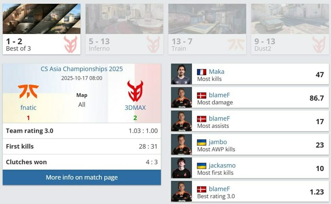 fnatic завершили виступ на CS Asia Championships 2025, поступившись команді 3DMAX у напруженому чвертьфінальному протистоянні з рахунком 1:2. Попри гідну боротьбу, британська організація не змогла втримати перевагу на вирішальній карті Dust2 і покинула турнір на стадії 1/4 фіналу.