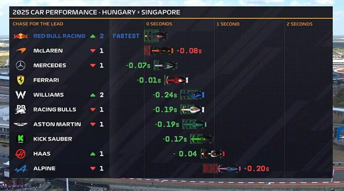 Традиційно Формула-1 під час трансляцій демонструє інфографіку, у якій видно розподіл сил між командами за офіційними даними Ф1, а також те, як вони відігрують або втрачають час відносно лідера, починаючи з конкретного етапу сезону. Цей показник є важливим індикатором поточної форми команд і дозволяє оцінити динаміку розвитку болідів.