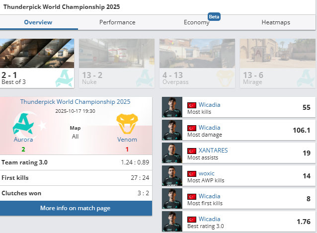 Aurora стала останнім учасником плей-оф Thunderpick World Championship 2025, упевнено перемігши Venom у вирішальному матчі групового етапу – 13:2 на Nuke, 4:13 на Overpass та 13:6 на Mirage.