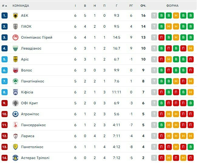 Турнірна таблиця чемпіонату Греції: АЕК (16), ПАОК (14), Олімпіакос (13)