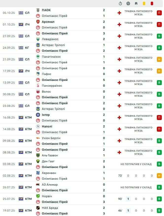 Статистика: Яремчук пропустив 14 матчів Олімпіакоса
