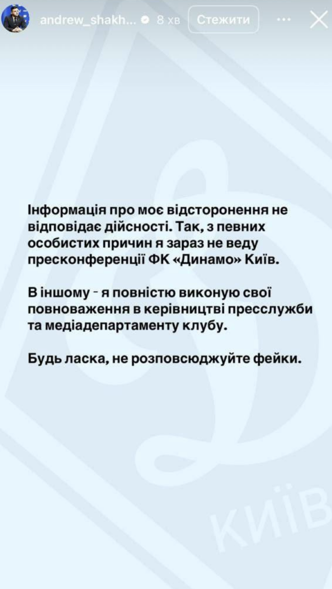 «Інформація про моє відсторонення не відповідає дійсності. Так, з певних особистих причин я зараз не веду пресконференції ФК «Динамо» Київ. В іншому – я повністю виконую свої повноваження в керівництві пресслужби та медіадепартаменту клубу.