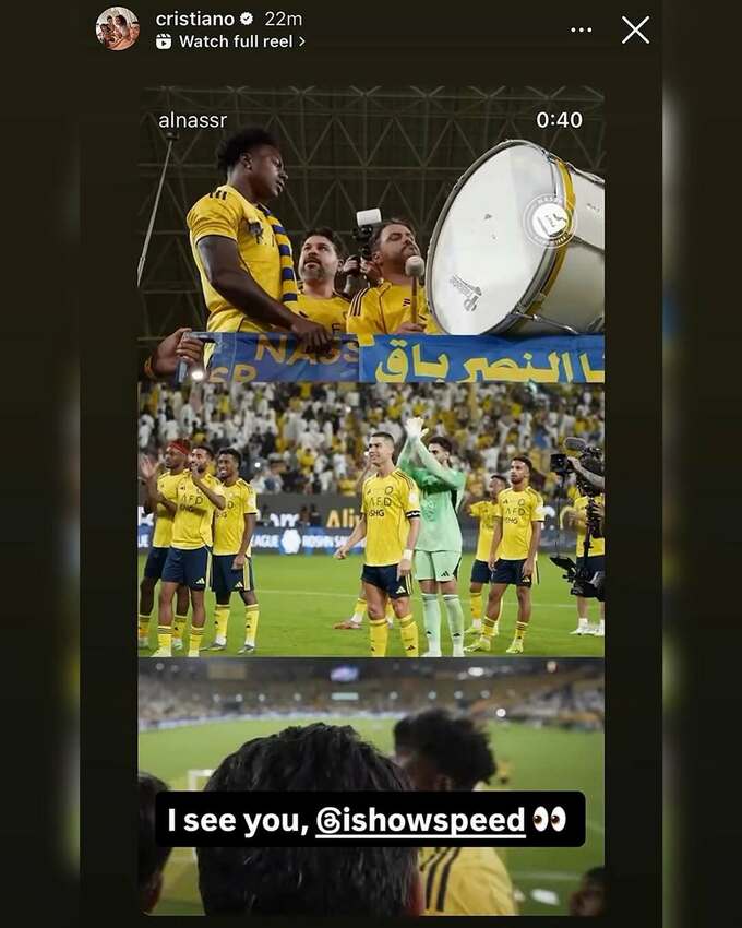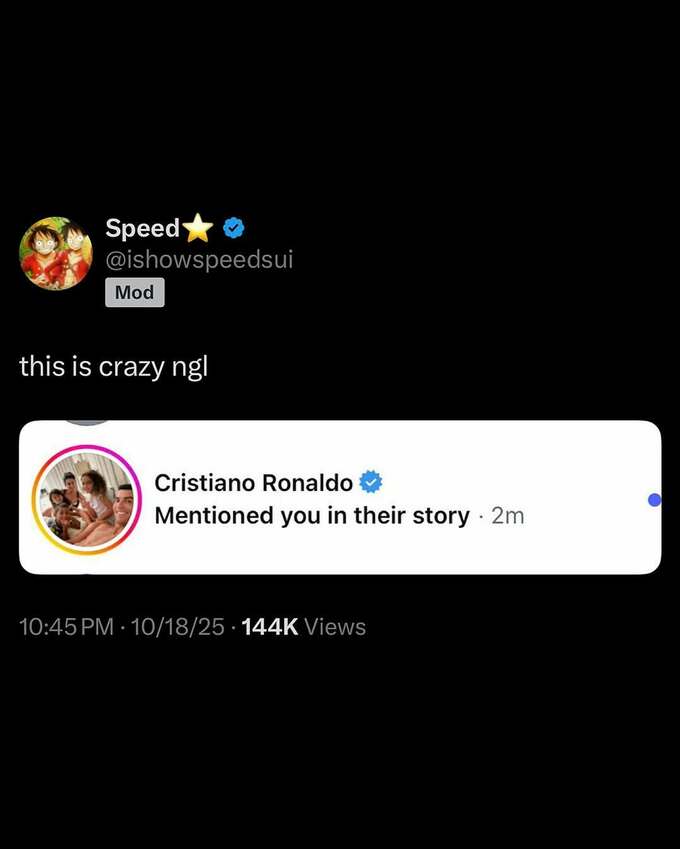 Speed, відомий своїми емоційними реакціями та криками «SIUUU!» на стрімах, уже не раз зустрічався з Роналду наживо, але тепер їх зв’язок став «офіційним» – CR7 не лише натиснув кнопку «Follow», а й опублікував спільне відео у сторіс.