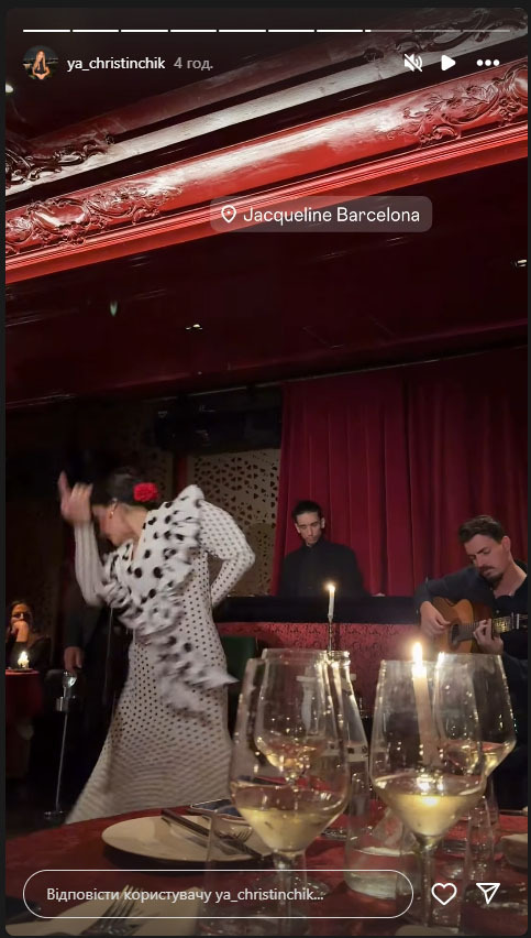 Згодом Кристина опублікувала відео з ресторану Jacqueline Barcelona, де компанія насолоджувалася атмосферним вечором із живою фламенко-програмою.