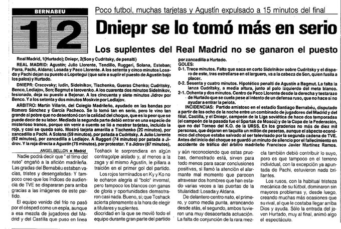 Невеличка передмова. З 4 по 20 січня 1990 року «Дніпро», готуючись до чвертьфінальних матчів Кубка європейських чемпіонів проти португальської «Бенфіки», проводив тренувальні збори в Іспанії на особисте запрошення президента мадридського «Реала» Рамона Мендоси. 16 січня дніпряни на «Бернабеу» обіграли Королівський клуб із рахунком 2:1. Голами в складі «Дніпра» відзначились Едуард Сон і Микола Кудрицький (із пенальті).