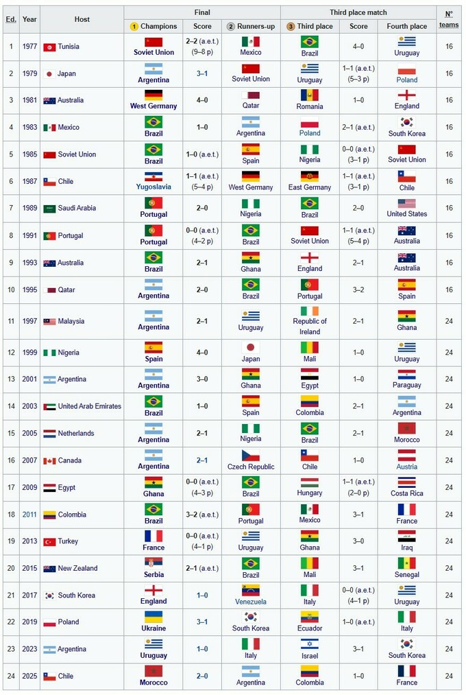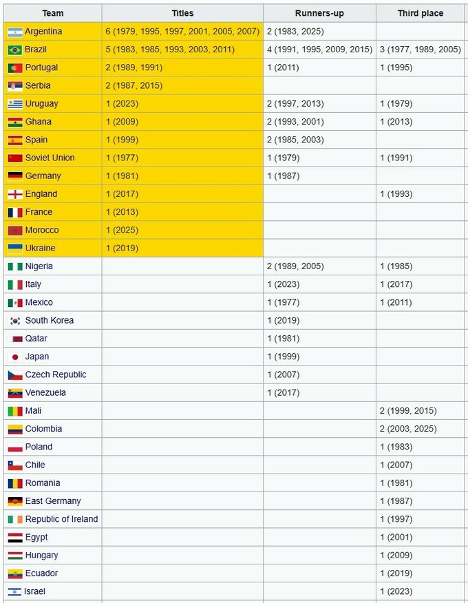 Кількість титулів ЧС U-20: Аргентина (6), Бразилія (5), Португалія, Сербія (по 2), Уругвай, Гана, Іспанія, СРСР, Німеччина, Англія, Франція, Марокко, Україна (по 1)