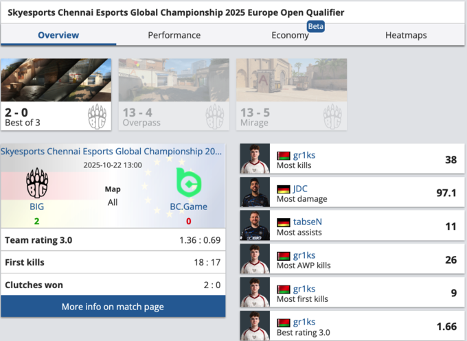 Німецька команда BIG здобула переконливу перемогу з рахунком 2:0 над BC.Game, забезпечивши собі місце на турнірі Skyesports Chennai. Для новачка німецького колективу Глєба «gr1ks» Газіна цей матч став справжнім проривом – він очолив таблицю за результативністю та став ключовим гравцем у перемозі.