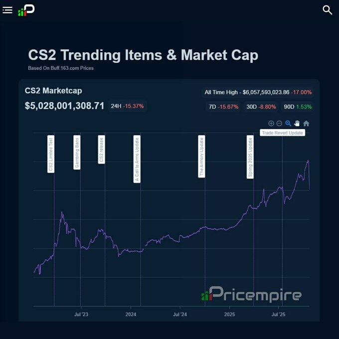 Згідно з даними платформи Pricempire, капіталізація ринку CS2 впала більш ніж на $1 мільярд за 12 годин – з $6,05 млрд до $5,02 млрд, що становить мінус 15,37%. Це стало найбільшим обвалом у сучасній історії гри.