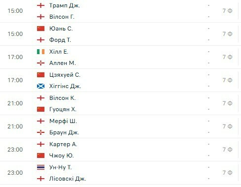- 17:00. Сі Цзяхуей (Китай) – Джон Хіггінс (Шотландія)