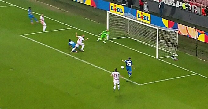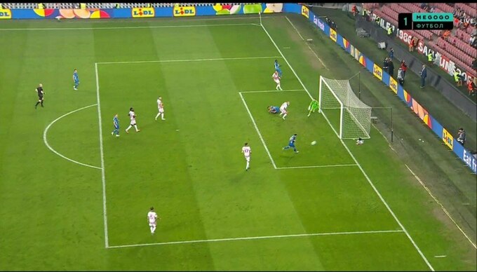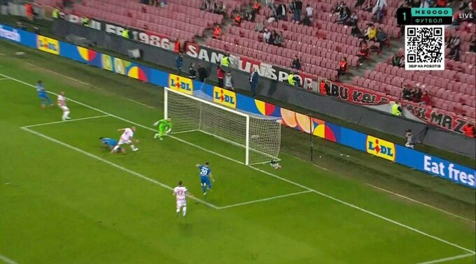 Правий захисник київського Динамо Олександр Караваєв не зміг забити у порожні ворота в матчі другого туру Ліги конференцій 2025/26 проти турецького Самсунспора.