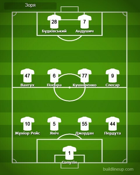 «Зоря»: Сапутін, Пердута, Джордан, Яніч (Дришлюк, 75), Жуніор Рейс (Маткевич, 75), Кушніренко, Попара (Мічін, 46), Андушич, Вантух, Слесар (Саленко, 75), Будківський.