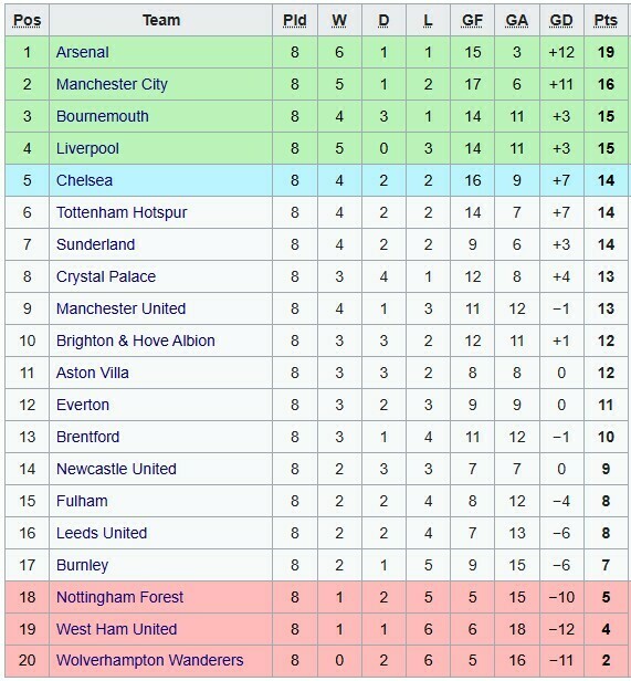 У верхній частині турнірної таблиці знаходяться: Арсенал (19 очок), Ман Сіті (16), Борнмут, Ліверпуль (15), Челсі, Тоттенхем, Сандерленд (14).