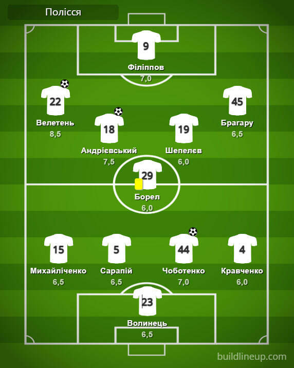 «Полісся»: Волинець – Михайліченко, Сарапій, Чоботенко, Кравченко (Хадрой, 46) – Борел – Велетень (Йосефі, 76), Андрієвський (Таллес, 60), Шепелєв (Назаренко, 46), Брагару – Філіппов (Гайдучик, 64).