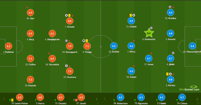 Найкращим за версією обох порталів став хавбек гостей Домінік Собослай, на рахунку якого один асист і оцінки 9,1 і 8,4 бали.