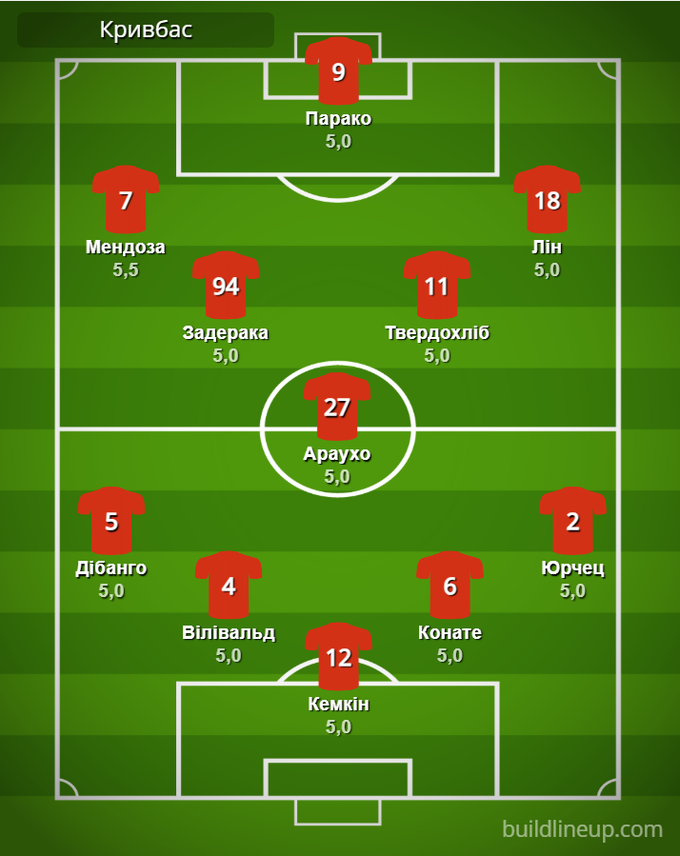 «Кривбас»: Кемкін – Дібанго (Бекавац, 90), Вілівальд, Конате, Юрчец – Задерака, Араухо (Я. Шевченко, 64), Твердохліб (Мулик, 90) – Мендоза, Парако (Мая, 77), Лін (Каменський, 64).