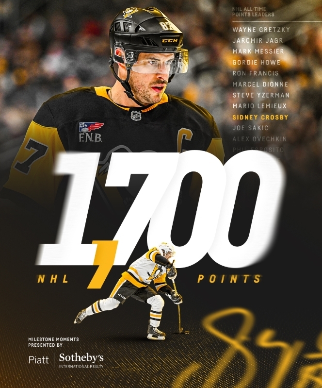 Кросбі єдиний діючий хокеїст НХЛ з 1700 очками і став дев'ятим гравцем в історії, хто зумів досягти такого показника.