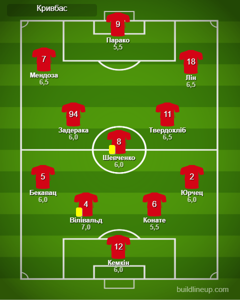 «Кривбас»: Кемкін – Бекавац, Вілівальд, Конате, Юрчец – Задерака, Шевченко, Твердохліб – Мендоза, Парако, Лін