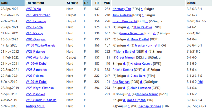 Усі фінали Снігур на рівні ITF у кар'єрі