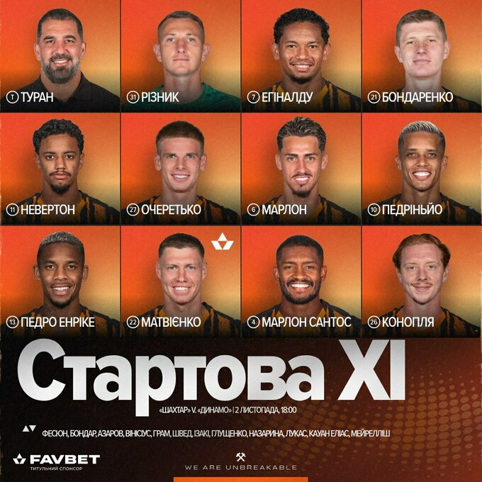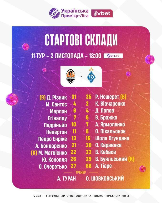 Головний тренер донецького Шахтаря Арда Туран та наставник київського Динамо Олександр Шовковський назвали стартові склади своїх підопічних на очне протистояння команд у матчі 11-го туру УПЛ 2025/26.