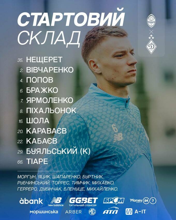 Динамо: Нещерет, Караваєв, Попов, Тіаре, Вівчаренко, Бражко, Піхальонок, Огундана, Кабаєв, Буяльський, Ярмоленко.