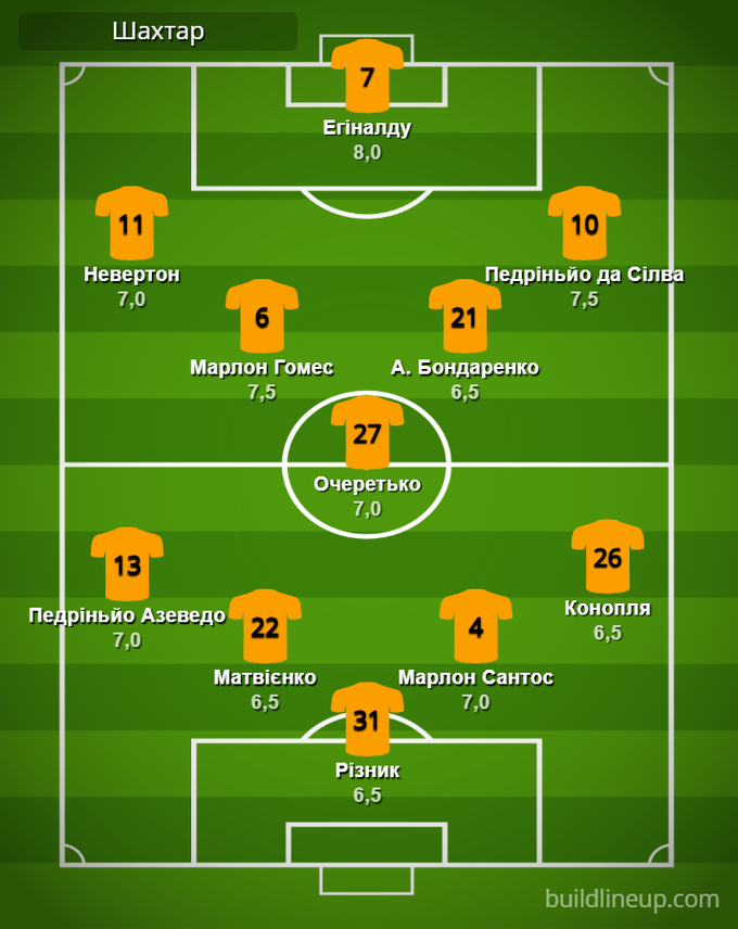 «Шахтар»: Різник – Педріньйо Азеведо, Матвієнко, Марлон Сантос, Конопля – Марлон Гомес, Очеретько, Бондаренко (Бондар, 67) – Невертон (Вінісіус, 67), Егіналду (Мейрелліш, 75), Педріньйо да Сілва (Ізакі, 75).