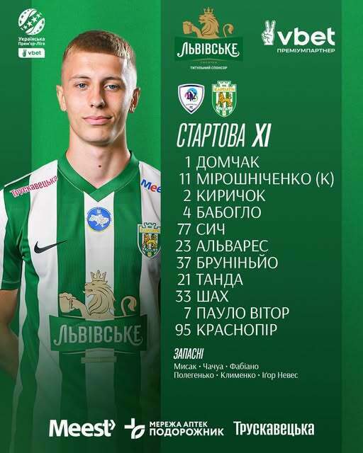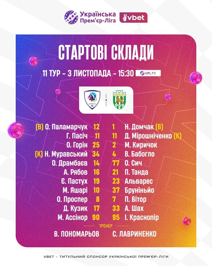 «Карпати»: Домчак – Мірошніченко, Киричок, Бабогло, Сич – Бруніньйо (Клименко, 90+2), Танда, Альварес – Шах (Чачуа, 61), Краснопір (Ігор, 71), Вітор.