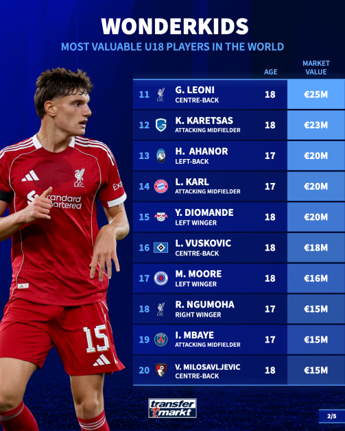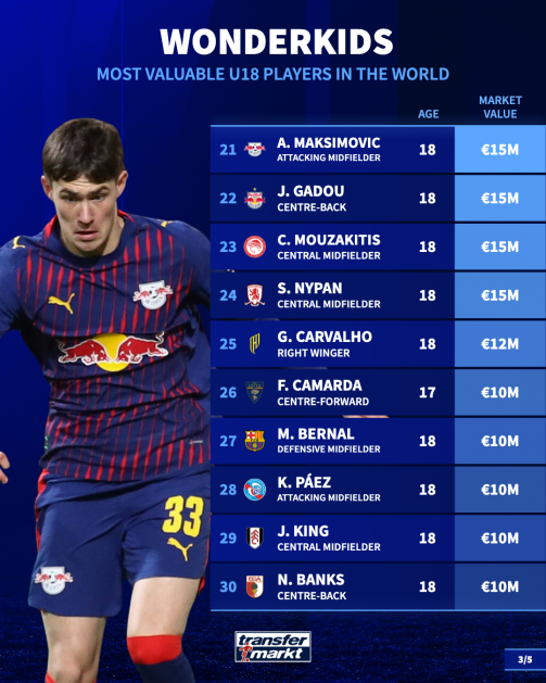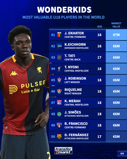 Портал Transfermarkt назвав 50 найцінніших футболістів світового футболу до 18 років (U-18) станом на поточний момент.