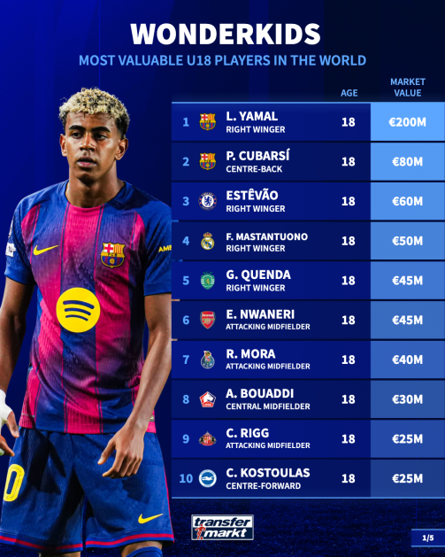 На самісінькій верхівці рейтингу опинилися два футболісти «Барселони» Ламін Ямаль (200 млн євро) та Пау Кубарсі (80 млн євро), а також вінгер «Челсі» Естевао (60 млн євро).
