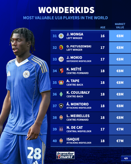 18-річний Ізакі розташувався на 40-му місці із оціночною вартістю контракту у 7 мільйонів євро, а його одноліток Лука Мейрелліш опинився на 38-му рядку, його вартість експерти оцінюють у 8 мільйонів євро.