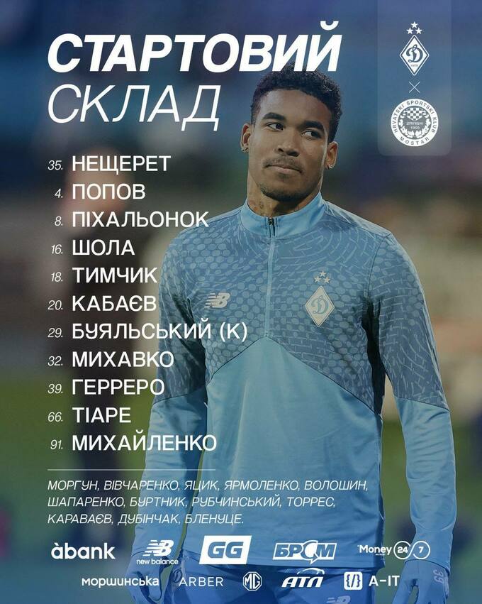 Головний тренер київського Динамо Олександр Шовковський назвав стартовий склад своїх підопічних на матч третього туру Ліги конференцій 2025/26 проти боснійської команди Зрінськи Мостар.