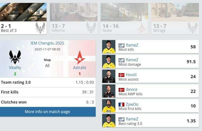 Vitality здобули перемогу над Astralis у чвертьфіналі IEM Chengdu 2025 з рахунком 2:1 за картами – Inferno (13:7), Nuke (14:16) і Mirage (13:7). Завдяки цьому Vitality забезпечили собі місце в півфіналі, де зіграють проти MOUZ за путівку до гранд-фіналу, який відбудеться у неділю, 9 листопада.