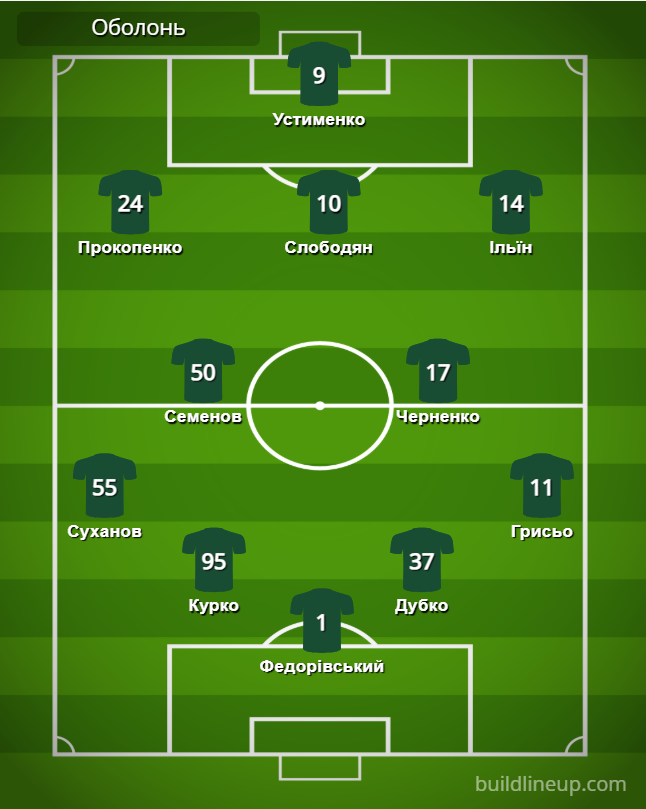 «Оболонь»: Федорівський – Суханов, Курко, Дубко, Грисьо (Є. Пасіч, 72) – Семенов, Черненко (Ломницький, 90+2) – Прокопенко, Слободян (Кулаковський, 72), Ільїн (Мединський, 64) – Устименко (Теслюк, 64).
