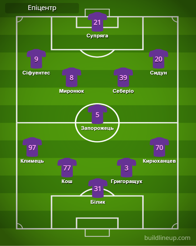 «Епіцентр»: Білик – Климець, Кош, Григоращук, Кирюханцев (Савчук, 59) – Миронюк (Джеоване, 59), Запорожець (Є. Демченко, 59), Себеріо (Ліповуз, 73) – Сіфуентес, Супряга (Борячук, 59), Сидун.