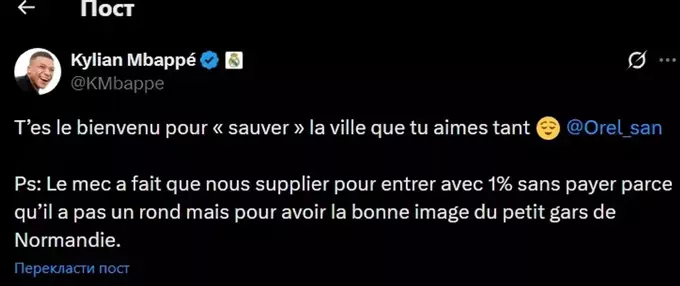 Нападник «Реала» та збірної Франції Кіліан Мбаппе відповів французькому реперу Орельсану, який висміяв його у новому треку за провал із клубом «Кан».